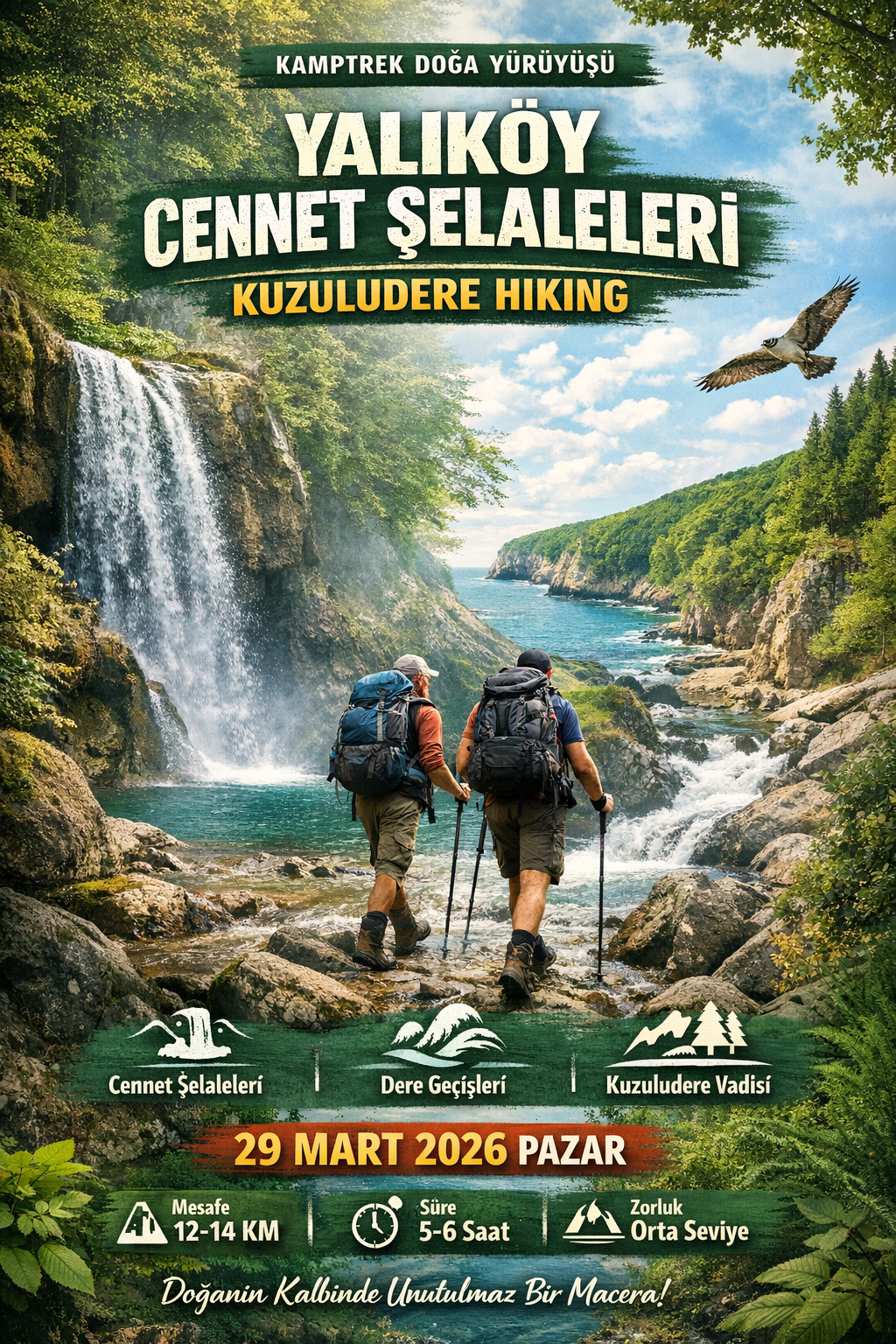"Ilkbaharin o taze kokusunu cigerlerimize çekecegimiz bu essiz rotada; Cennet Selaleleri’nin ugultulu sesinden baslayip, gizemli Kuzuludere Vadisi’nin derinliklerine süzülecegiz.