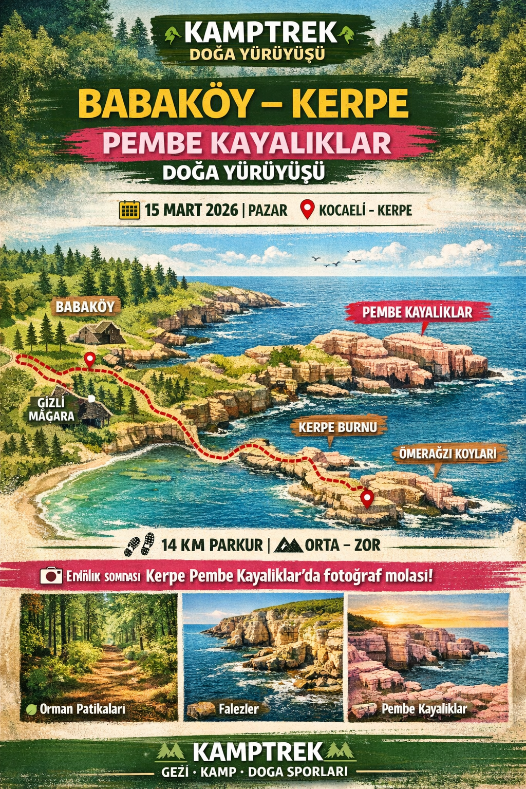 Parkur: Inisli çikisli orman yollarini ve kiyi patikalarini takip ederek; sirasiyla Kerpe Burnu, masmavi Ömeragzi Koylari ve merak uyandiran Gizli Magara rotasindan geçecegiz.