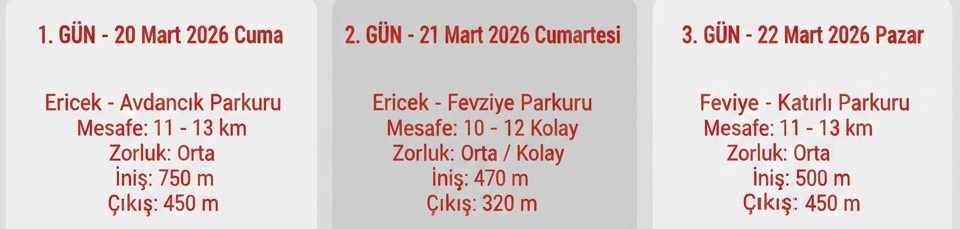 2. GÜN 21 MART 2026 CUMARTESI : 10:00'da otelden ayriliyoruz. Ericek - Fevziye parkurumuzu yapiyoruz. Tahmini 16:00 da oteldeyiz. (Isteyen arkadaslar Bursa'da kalabilir. )