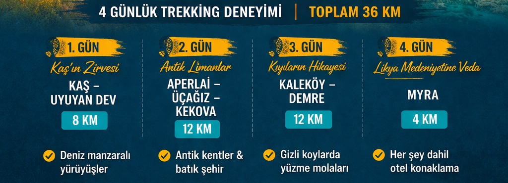 Likya Yolu’nun 540 kilometrelik devasa parkuru içinde öyle bir hat vardir ki, ayaklarinizin altindaki patika her virajda sizi baska bir "turkuaz" ile tanistirir. Kas’in dik yamaçlarindan baslayip, Kekova’nin batik sehirlerine uzanan ve Demre’nin antik ihtisamiyla son bulan bu rota, bir yürüyüsçünün görebilecegi en güzel rüyadir.