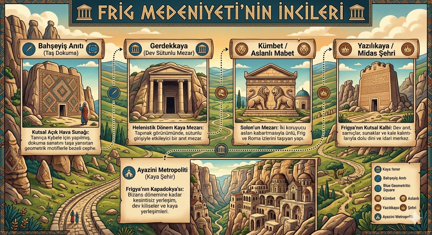 Frigya’nin dini baskenti Midas merkezli üç ana rota üzerinde; doga ve tarihin iç içe geçtigi essiz duraklar yürüyüsçüleri bekler. Frig Yolu’nda yürümek, sadece bir parkur tamamlamak degil; efsanelerin içinden geçmek, tasa kazinmis binlerce yillik bir hikâyeye adim atmaktir.