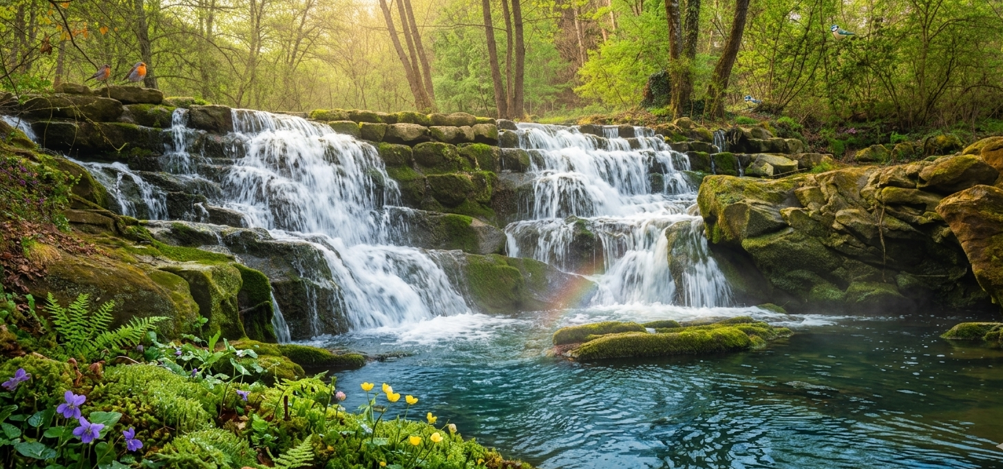 Selale Manzarasi: Parkur üzerindeki küçük selaleler ve göletlerii görüyoruz. Ve çevresinde sakin bir mola veriyoruz.